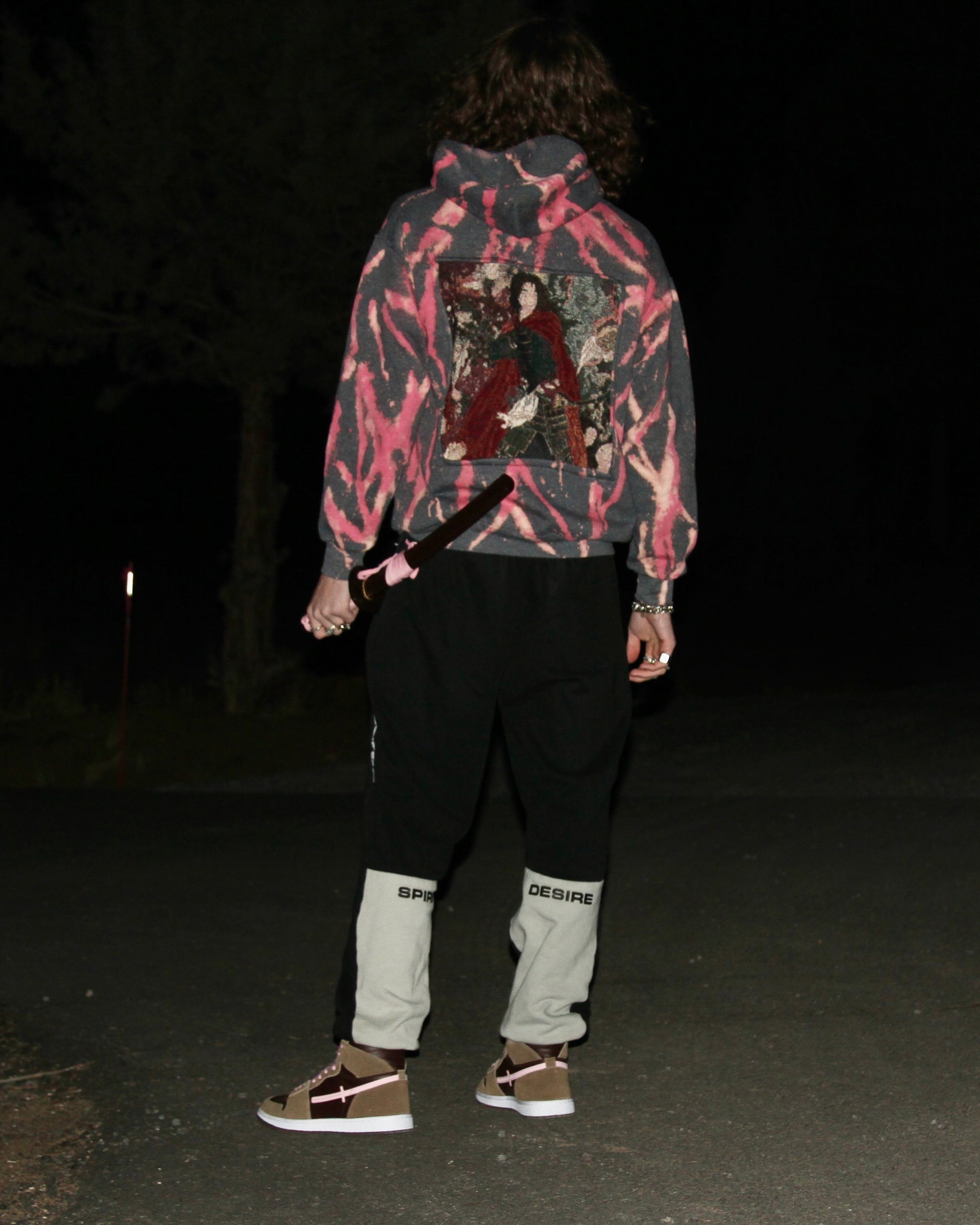 1/7 handmade reverse tie died, embroidered, tapestry patch hoodie.